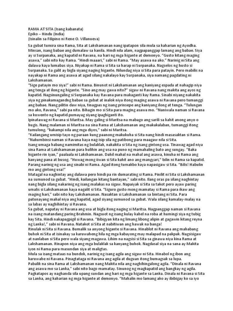 Epiko rama at sita isang kabanata cast. Buod - Nakatira ang mag-asawang Rama at Sita kasama si Lakshamanan sa gubat noong ipinatapon sila mula sa kaharian ng Ayodha. Hindi maaari sabi ni Rama. Nang dahil sa galit ay bigla siyang naging higante.