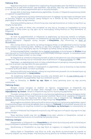 Ang Epiko ni Gilgamesh isang akdang patula na mula sa Mesopotamia Iraq kinilala ito bilang kauna-unahang dakilang likha ng panitikan. Siya sa pagsasasaling-wika ng mga teksto tulad ng epiko ni Gilgamesh. EPIKO NI GILGAMESH Salin sa Ingles ni Andrew George SALIN NI eddie lauyan de fiesta esteban Tablet 1 Ang Hari ng Uruk na si Gilgamesh na dalawang-katlong diyos at sankatlong mortal ang kinikilalang hari ng mga hari ang pinakamalakas sa sangkatauhan.