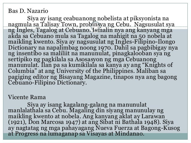 A STUDY OF THIRTEEN CEBUANO STORIES Rosario Cruz-Lucero Introduction This paper is a study of thirteen short stories by Vicente Sotto twelve of them appearing originally in 1908 and reprinted in a collection published by the University of the Philippines in 1998. 32 Saglit na Kasiglahan Ito ay ang panandaliang pagtatagpo ng mga tauhan sa kwento. View Panitikan ng Rehiyon 7 Menordocx from ARTS MISC at Columbia College.